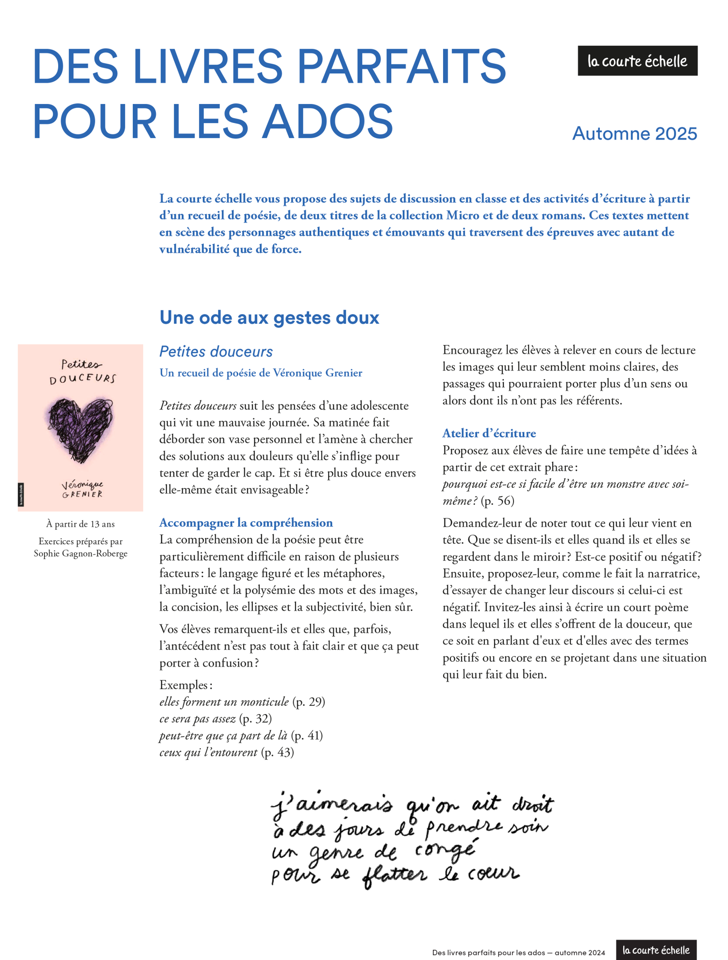 De nouvelles activités d’écriture, et des sujets de discussion à lancer en classe autour des nouveautés pour ados de la courte échelle.